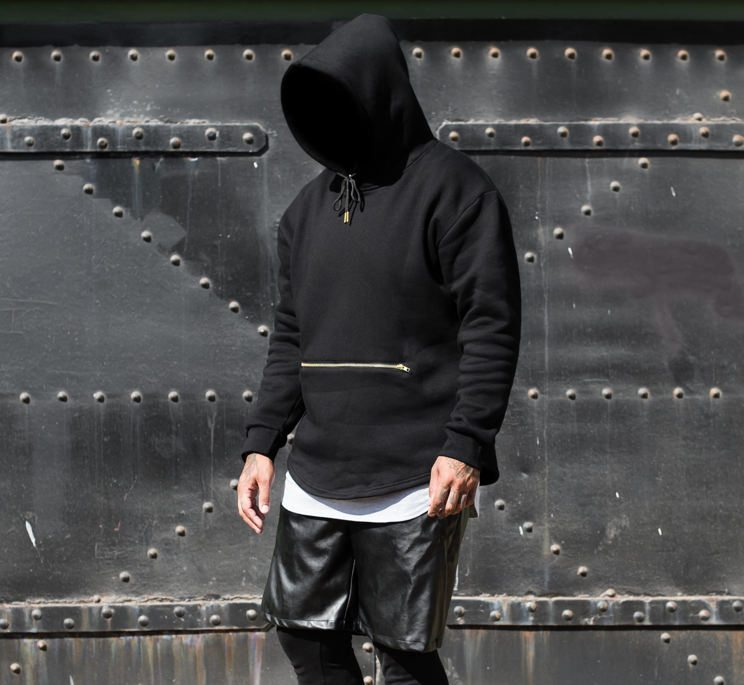 The sweater is 100% luxurious cotton with a Gold zipper pouch and cap drawstrings. It’s heavy duty, super warm and sit’s right on point with the other material. It’s built to all be warn together and it looks good that way too. Nice work.